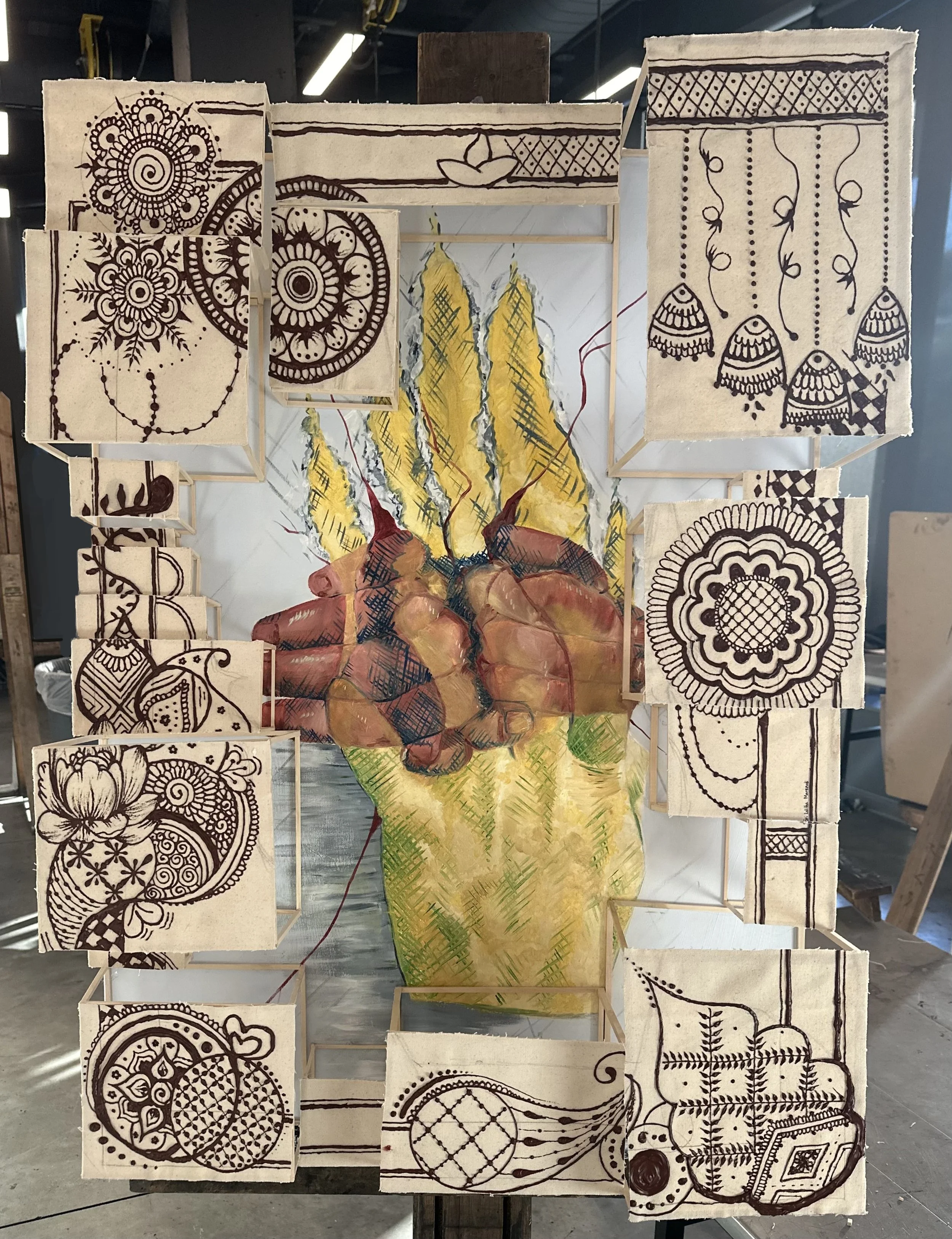Breaking Through, Acrylic and oil paint, Red and Yellow Turmeric mixed with Linseed oil, wooden dowels, and heavy medium acrylic paint, 2ft x 3ft